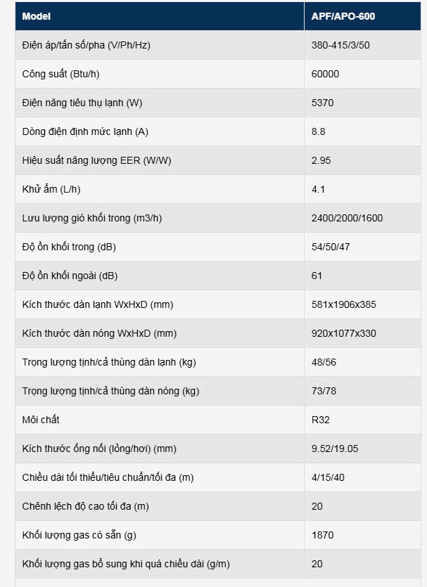 Thông số kĩ thuật điều hòa tủ đứng APF/APO-600