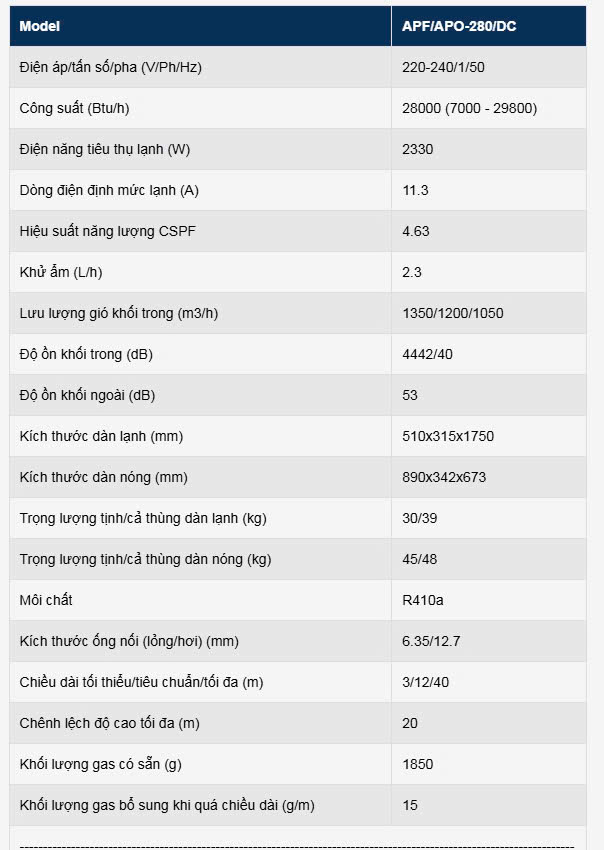 Thông số kĩ thuật điều hòa tủ đứng 3HP APF/APO-280/DC