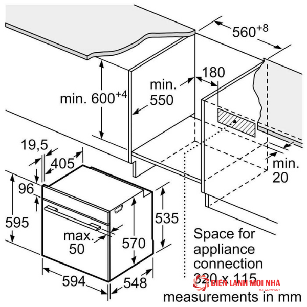 Kích thước lắp đặt (CxRxS): 600 x 560 x 550 mm