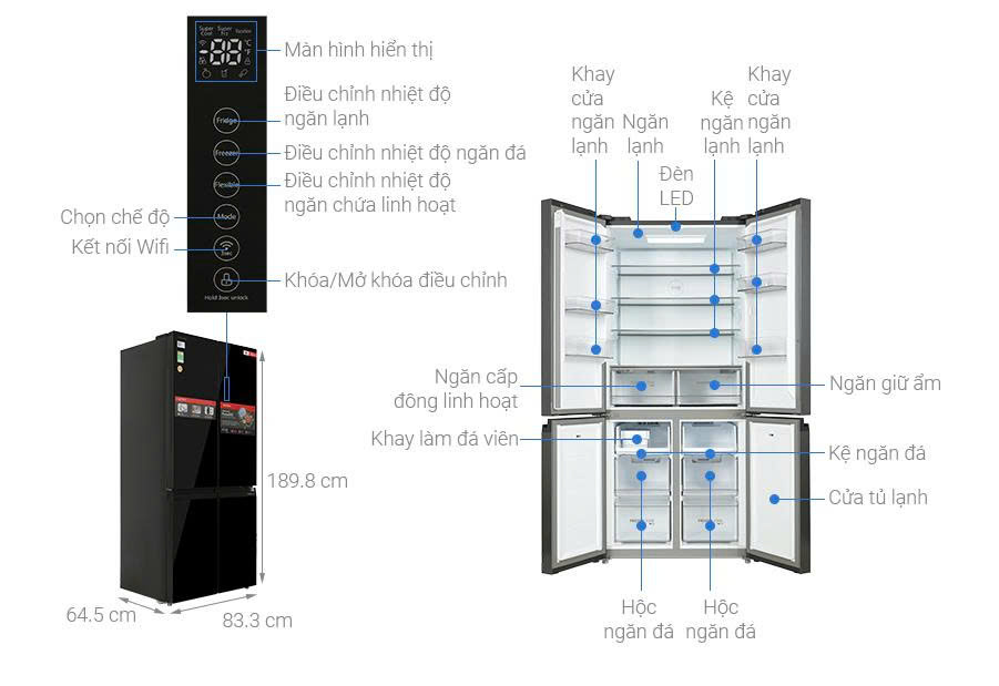 - Tiện íchBảng điều khiển cảm ứng tích hợp ngay trên cửa Kết nối thông minh, điều khiển từ xa Quản lý thực phẩm Ghi nhớ lịch sử mở, đóng tủ Nhắc nhở thông minh Chế độ vắng nhà Cảnh báo cửa mở Đèn LED Chẩn đoán bằng AI (trí tuệ nhân tạo) Thống kê điện năng tiêu thụ