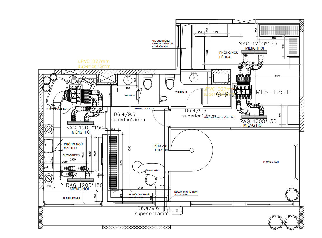 Với không gian 1 trệt 1 lầu gồm các công năng: Phòng khách, phòng ngủ bé trai, phòng giải trí, Phòng ngủ Master. Điện Lạnh Mọi Nhà đã tư vấn cho khách hàng hệ thống điều hòa cục bộ giấu trần nối ống gió kết hợp với hệ thống Multi LG