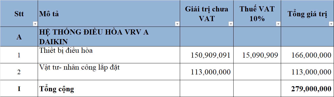Tổng chi phí hệ thống điều hòa gồm thiết bị và vật tư nhân công lắp đặt