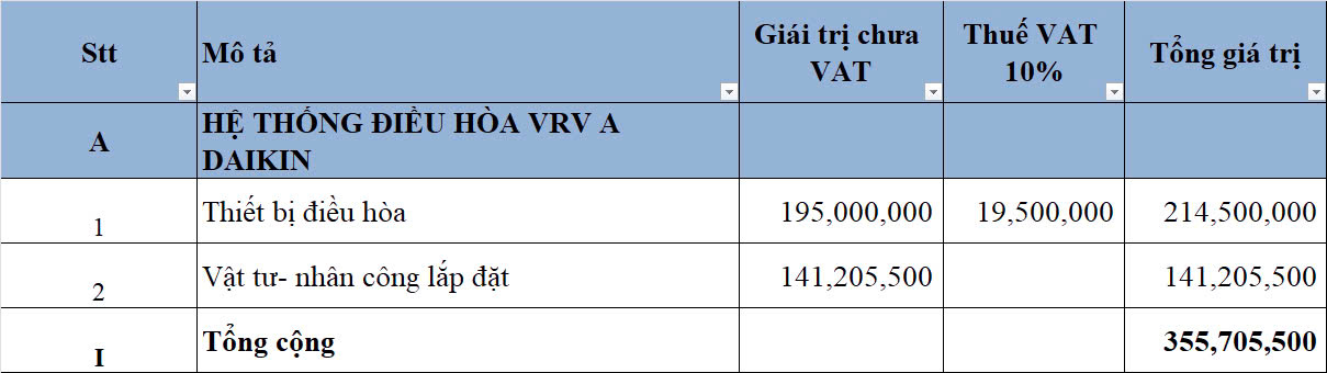 Tổng chi phí hệ thống điều hòa gồm thiết bị và vật tư nhân công lắp đặt